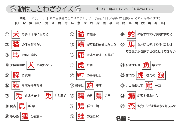 動物の名前を当てる ことわざクイズ 動物編 無料プリント シニアの